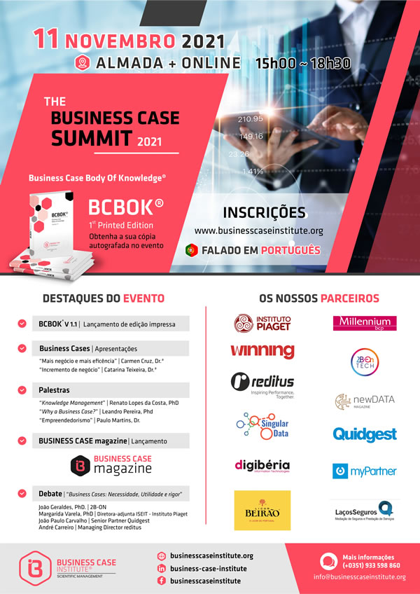 Decorreu no passado dia 11 de novembro o The BUSINESS CASE SUMMIT 2021, evento promovido pelo BUSINESS CASE INSTITUTE®, integrado no âmbito de atividade deste instituto, que se dedica à promoção das melhores práticas para desenvolvimento de Business Cases.